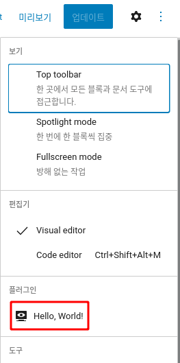 즉, PluginSidebarMoreMenuItem을 사용하면 아래처럼 결과가 작성된다.