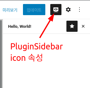 PluginSidebarMoreMenuItem의 target 속성과 PluginSidebar name 속성은 서로 같게 이어준다. title 속성은 사이드바 최상단 제목을 위한 텍스트이고, icon은 사이드바가 즐겨찾기 추가되었을 때 보여질 아이콘이다.