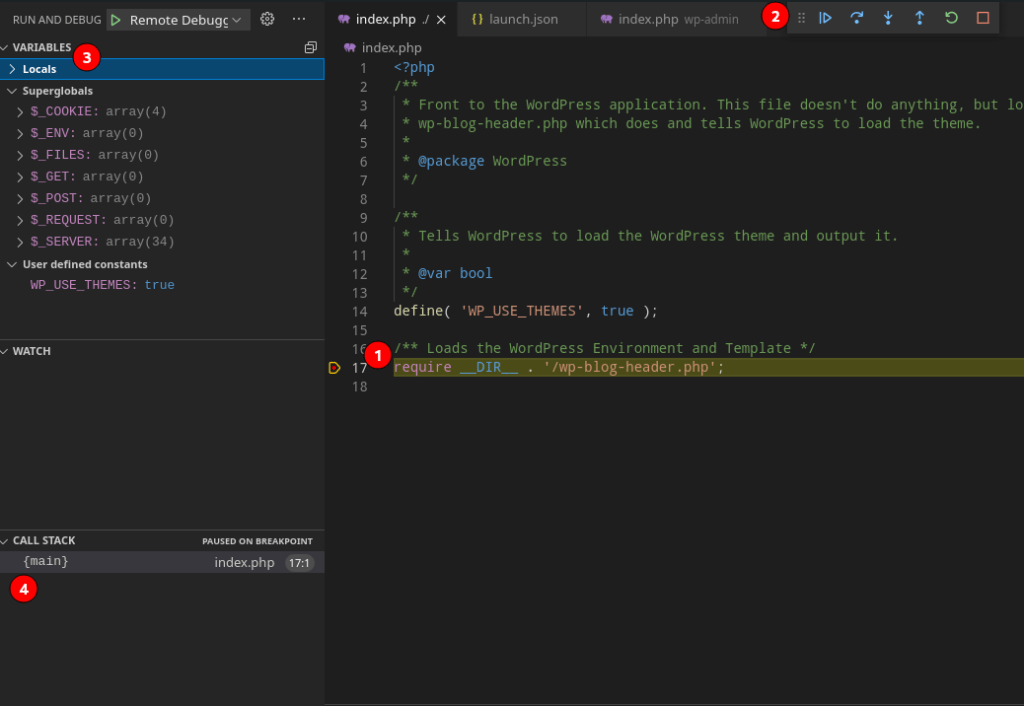 워드프레스의 프론트 메인 파일인 index.php에 적당히 브레이크 포인트를 넣고 디버깅을 시작해 봤다. 아래처럼 PHP 처리가 중간에 멈추면서, 해당 과정 중의 콜스택, 변수 정보를 모두 속속들이 볼 수 있다. 여기에서 함수 안으로 들어갈지, 다음 코드 라인으로 진행할지 결정할 수 있다.