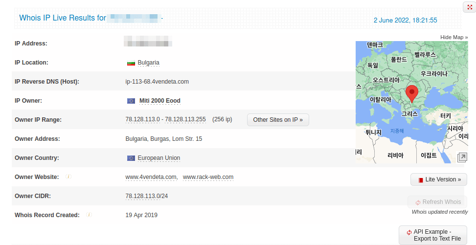 IP 조회를 해 보면, 진짜 아무 연고도 없는 곳입니다. 이제 로그 특정 부분을 따다 IP 부분만 수집합니다.